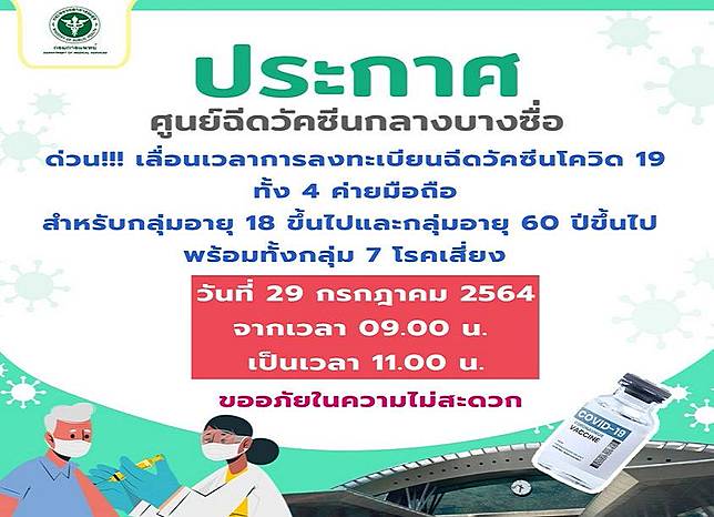 Source: news.thaipbs.or.th 3 ค่ายมือถือพร้อมใจกันแจ้ง กรมการแพทย์ ขอเลื่อนเวลาในการเปิดลงทะเบียนจองวัคซีน ที่ศูนย์ฉีดวัคซีนกลางบางซื่อ จาก 09.00 น.